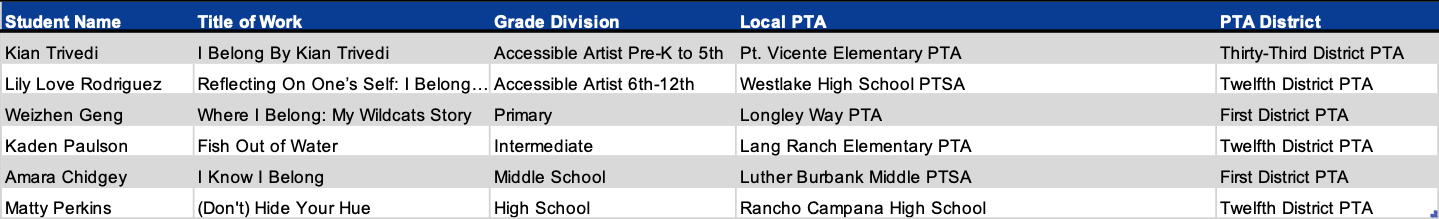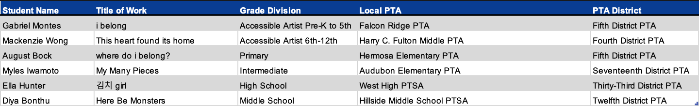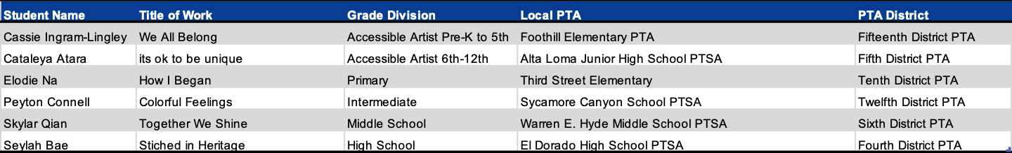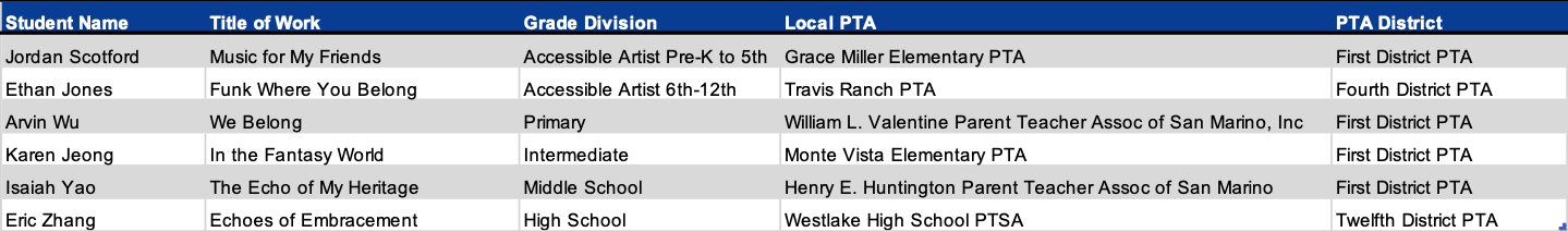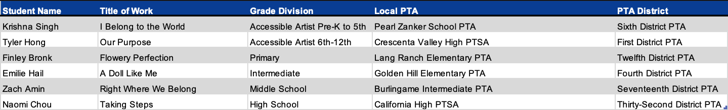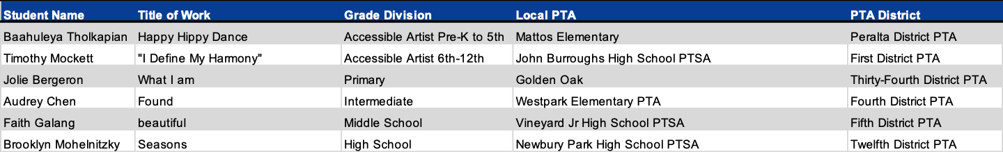 Programs + Events Award of Merit California State PTA would like to congratulate the following students for their Award of Merit in the 2025-2026 Reflections Art Program. Dance Choreography Film Production Literature Music Composition Photography Visual Arts