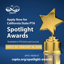 Don’t forget to apply for California State PTA’s Spotlight Awards. The Awards celebrate outstanding programs in Advocacy, Collaboration, Diversity, Equity and Inclusion (DEI), Environmental, Family Engagement, Membership and Outreach, Student Achievement and/or Engagement, and Leadership Development. It’s easy to apply and we want to hear about all the wonderful things your PTA units and councils are doing! The application deadline is January 16, 2026.